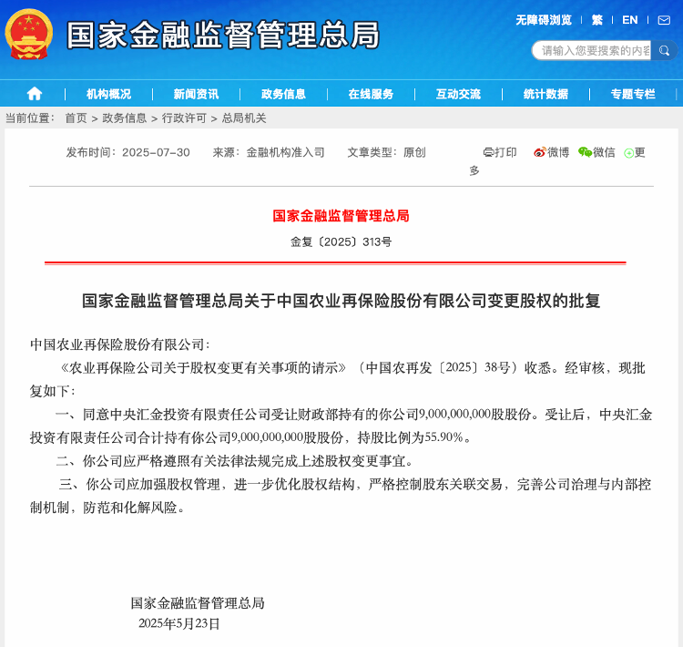 海报记者新闻是利利(Leilei)7月30日报道说,国家金融监管管理局已宣布批准,并同意收购中国农业再保险公司(Ltd.收购后,中部休伊(Central Huijin)参与了55.90%的参与,并成为公司的控制股东。今年2月,中国的农业重新发行宣布,该公司的控制股东财政部拥有免费的所有股份(约占已发行总股票的55.90%)。完成转让后,财政部将不再退休中国农业有限公司,这种变更股东的变化是通过自由转让国家利益进行的,不包括基金支付。就像我的佩斯(País)中唯一的农业再保险一样,中国的农业定居点具有非凡的环境和重要e。 2019年11月,州议会正式批准建立中国农业的重新教育,以加快在财政支持的情况下建立农业保险灾害风险多样化机制。中国农业的强化是由九个部门启动和建立的,包括中国再保险公司(集团)有限公司,中国中国农业发展银行,中国联合房地产保险公司和中国房地产保险公司,有限公司,有限公司,有限公司房地产保险公司,有限公司,资本记录高达16.1亿亿美元。国际商业与经济大学创新风险管理中心副主任朗格(Long GE)在一次采访中,即股票转让是对中国金融机构资本结构的调整的一部分。在中国农业集团的ITCase中,股票转让后,其市场功能和面向市场的业务更加糟糕塞利整合。现在,中国农民可以利用Chuo Hu Chie的管理经验来提高农业事故风险的多元化效率,并将其更多地整合到国际再保险市场中。 Huijing Central成立于2003年12月,据了解,它位于北京。它代表了一个国家,该州根据法律对主要金融公司(例如州商业银行)的投资者行使其权利和义务。根据中部Huijing的官方网站,截至2024年6月30日,Huijing中部直接在19个金融机构中押注,其中包括7家银行,6个整体机构,两个跑步者和4家保险机构。中国中国中国中国农业有限公司。在Dand之后,他们的许可保险机构增加到5,而剩下的四个控制中国在中国信用保险公司之后的中国农业农业后的农业Oration,中国再保险公司(集团)有限公司,新华社人寿保险公司,有限公司,有限公司和中国人寿保险公司,中国人寿保险公司,有限公司。它加强了由农业再保险(中国农业再保险),出口信用保险(中国信用保险)和灾难再保险(中国再保险)涵盖的“国家风险保护网络”,并协调了农业/灾难等系统性风险。此外,它可以与中国的再保险合作开发子保险产品,并与银行业(例如农业发展银行)合作,以创建“农业保险数据 +信用风险控制”的闭路电路,以优化资源分配。