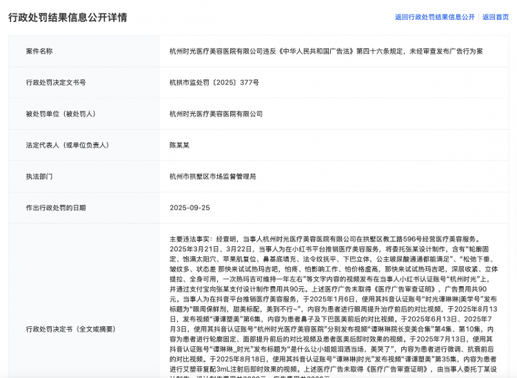 海报新闻记者最近宣布,智格政府服务的净努力。罚款决定表明,该机构在Xiaohongshu“ Hangzhou Time”的认证帐户中发布了一段视频,其中包括诸如“所有公主透明质酸可以填充”和“ Themagi持续一年”之类的促销文本。广告评论证书。同时,Douyin平台上的多个经认可的机构也遭受了类似的违规行为。根据调查,从2025年1月到2025年8月,该机构通过他的Doyin帐户在医疗后发布了许多患者比较视频。这些视频中的内容包括围绕周围的提升治疗,轮廓,面部抬高,调整后的抗衰老和其他元素治疗有效性的比较。这些是医疗广告,但尚未获得“医疗广告证书”。该机构为这些视频的设计和制作支付了3,000元人民币。吊挂Hou Gongshou地区的监督和控制办公室认为,该机构的行动违反了中华民国广告法第46条。这证实了事实,监管机构应根据第58条,《中华民国广告法》第14段,第14段和“医疗广告控制措施”的第22条对该机构施加行政处罚。根据该报告,在Zhao Time的Hangzhou Time Hangzhou医学美容院在Hangzhou Time Hangzhou Medical Beauty Hospital花了9,300元之后。旧,并要求退款用于手术费用,并补偿了随后的维修。医院董事天蒂安(Tian)拒绝了他的要求,称术前和术后比较没有明显变化。赵说,他觉得自己在朋友们的眼中“很棒”。今年3月,另一位陈在1818年告知Goldeneye,他在医院将“公主的透明质酸”注入了F下巴生病。他出现症状,例如颈部周围的笨重的血管,并在手术后几个小时伸出肌肉,但他仍然没有减轻10天。调查后,“透明质酸公主”的范围是注射鼻唇膏,并怀疑医院超过了非法手术。最初,医院同意全额退款,但是在陈要求媒体帮助后,他只同意50%的退款,而当事方没有达成协议。公共信息表明,杭州时代医疗美容院有限公司,成立于2007年,位于Z江苏省。 Gongshu区Ciudad de Zhou 596号的Jiaogong Road是一家由杭州市卫生部批准的塑料和化妆品手术专业医院。美容院有七个主要部门不可思议的美容中心,口头美容中心,脱毛中心,半永久化妆中心和私人维护中心。