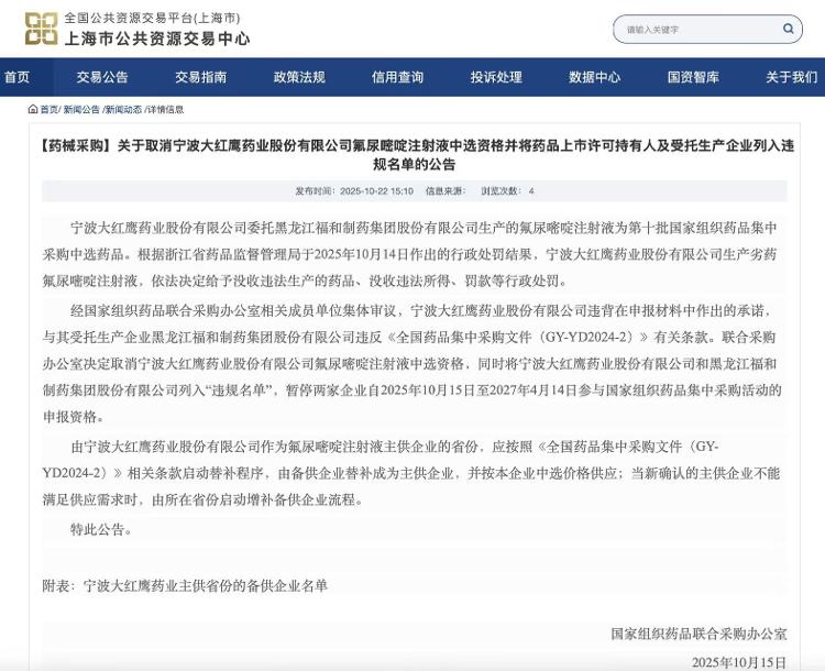 海报新闻记者刘静一报道,10月22日,国家药品集中采购联合局发布公告,正式撤销宁波大用营药业有限公司(以下简称“宁波大用营”)生产的氟尿嘧啶注射液集中采购资格,包括该公司及其合同生产企业黑龙江 福和。黑龙江福娃制药集团有限公司(以下简称“黑龙江福娃制药”)已被列入《侵权名单》。广告截图 据公开资料显示,宁波大用营成立于1956年,由国营宁波制药厂和宁波制药二厂改制而成。 2013年成为海尔生物制药股份有限公司子公司,是一家集药品生产、研发、销售于一体的综合性制药公司产品。公司注册资本1.2亿元,法定代表人于建伟先生。来源:宁波大鸿鹰官网海报新闻记者(记者微信公众号:HaibaoNewsSw)查询发现,这一决定是由于今年10月14日浙江省食品药品监督管理局作出的行政处罚决定。上述处罚结果是,宁波大永营生产的氟尿嘧啶注射液被认定为掺假药品,依法给予没收非法生产药品、没收违法所得、罚款等行政处罚。根据上述行政处罚结果,国家机关药品联合采购局认定,宁波大红鹰、黑龙江福和药业的行为违反了《国家药品集中采购文件(GY-YD2024-2)》的相关规定,并认为:宁波大宏盈违反了其在申请材料中作出的承诺。公告称,联合采购办公室决定取消宁波大红鹰氟尿嘧啶注射液在国家组织的药品集中采购中的资格。宁波大宏盈、黑龙江福和药业被列入“违规名单”。上述两家企业自2025年10月15日至2027年4月14日将无法申请参加政府资助的药品采购活动。为保证相关部委药品稳定供应,本公告还透露了供应替代机制。在宁波大永营为氟尿嘧啶注射液主要供应商的省份,按照中央采购文件的规定实行替代流程,其中备用供应商承担一级供应商的角色,并按原中选价格供货。如果新的主要供应商不能当满足市场需求时,相关国家可以添加新的备用供应商。启动添加流程。另外,根据国家药品联合采购管理局同时发布的暂停采购资格通知,要求多家医药机构和药品生产企业停止采购宁波大永营生产的相关规格氟尿嘧啶注射液(10ml:0.25g)。