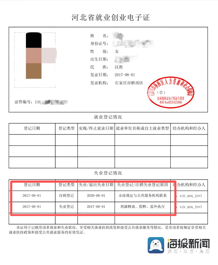 海报新闻记者田刘报道海报新闻(微信记者:HaibaoNewsSw)近日接到举报,石家庄市居民张女士在河北职工社保申请上查询自己的社保信息时,发现她名下的《就业创业证明》上登记为“刑满释放、假释、监管释放”。制成。 11月13日,海报新闻记者联系了石家庄桥西区就业服务中心。对方表示此事已经解决,但没有提供太多细节。照片由陈先生提供。张某告诉记者,11月6日,他误打开河北省人事社保申请表“失业/就业”栏目,发现自己持有2017年8月1日开具的“就业证明”。该证明上注明,登记原因为tration 是指“在监狱外服刑后被判刑、假释或释放”。所附电子照片包含张某的照片、身份证号码、家庭住址等真实信息。并加盖桥西区人力资源和社会保障办公室公章。 “我从来没有违反过任何法律,我的家人都是合法公民。当我看到这个记录时,我很惊讶。”陈说,他最初以为是网络延迟,但下载电子版后,他确认信息正确。发现问题当天,张某多次联系卡什西区就业服务中心。对方最初的回应是:“既然区里不知道此事,我们必须向市里汇报。”在后续的沟通中,相关部门以两种方式回应:“记录无法更改,对人没有影响”和“记录已被删除,问题已解决”。陈先生坦言,他对此事的处理方式并不满意,认为登记错误会对自己的工作和家庭造成影响,因此要求有关部门调查原因。经多次联系,未果,11月7日,张先生前往恰西区就业服务中心交涉,后拨打110报警。警方经调查,确认陈先生没有犯罪记录。11月11日,桥西区就业服务中心告知张先生,已找到2017年办理证明的手写信息原件,并提供了一份信息复印件给张先生,这些信息包括户籍页复印件、居委会证明、身份证复印件以及登记的《就业创业证明》。rm。注册表包含陈的详细个人信息和他的手写签名。张确认签名和注释是真实的,但表示当时他正在工作,不记得为什么要求提供证书。他还承认,当时不存在第三方培训、户籍转移等相关情况。对于这个问题,该负责人只是解释道:“有可能是工作人员在录入当年的数据时出错了。”因为已经过去很多年了,过程中也出现过人事变动,一直没能找到负责当年的人。直到目前,相关部门已删除了错误登记记录,但尚未对情况做出官方解释。 “我想要的不仅仅是清除记录,而是知道为什么会发生这个错误,”陈告诉记者。 11月13日,海报新闻报道记者联系了石家庄市桥西区人事社会保障局和桥西区就业服务中心,均表示此事已处理。卡什西区就业服务中心的工作人员表示,他们已经联系了张本人。我通过了,但是不知道还有没有其他要求。如果您能为我们提供新的建议,我们将不胜感激。一旦通过,我们将及时发布公告。海报新闻报道热线:010-64004224,微信报道:HaibaoNewsSw。