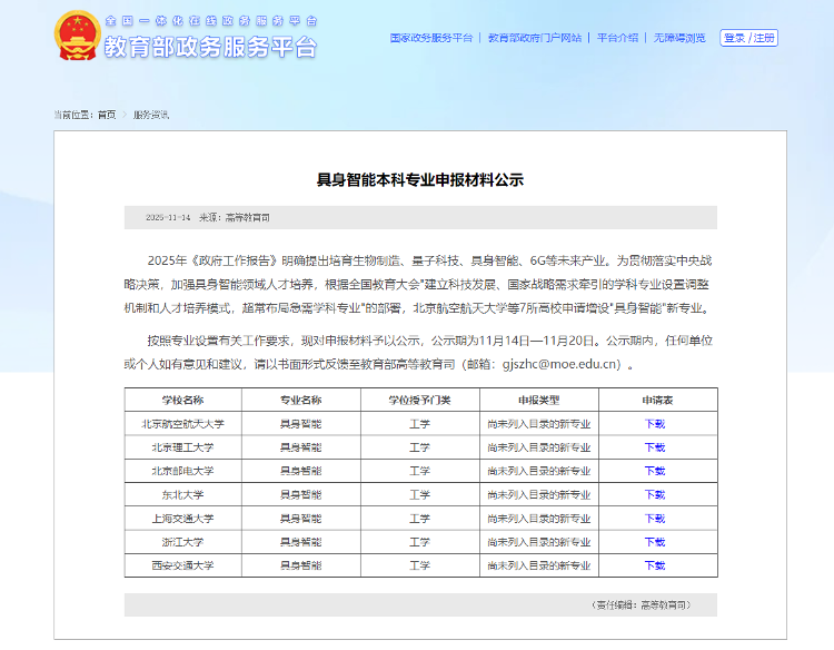 近日,教育部宣布在七所大学增设“具身智能”专业。 2025年政府活动报告明确提出培育生物制造、量子技术、嵌入式智能、6G等未来产业。我国“十五五”规划明确提出培育包括嵌入式智能在内的未来产业。 “体智”专业成为高中生及其家长的新选择。什么是“具身智能”?当人工智能有“身体”时,具身智能就意味着人工智能有“身体”。人工智能将被集成到机器人、智能汽车等物理设备中。人工智能就像机器人的“大脑”,负责感知、思考和决策。机器人为人工智能提供了一个“身体”,使其能够与现实世界互动并获得经验和知识。从“思想家”到“行动者” 具身智能有哪些特征曾经?传统人工智能主要依赖于数据和算法,通过文本、语言等符号与我们进行交流。嵌入式智能依靠身体和传感器通过运动、触摸等方式与世界互动。例如,当你悲伤时,传统的人工智能可能会向你发送一条安慰信息,但具体的智能机器人实际上可能会给你一个拥抱。传统人工智能通过分析大量现有数据来了解世界。具身智能和人类一样,不断挑战自我,犯错误,在现实环境中学习,逐渐掌握技能。就像孩子学走路一样,具身智能可以通过不断的尝试和错误积累经验来适应不断变化的复杂环境。具身智能已悄然登陆这些领域。具身智能已经悄然落地许多领域,正在慢慢走进我们的生活。工厂里的“超级工人”。在汽车等场景在工厂和电子制造领域,智能嵌入式机器人执行自动质量检测、零件分类和运输等复杂任务。康复中心的“钢铁康复师”。在一些康复中心,人形外骨骼正在帮助中风患者重新学习如何行走。他们使用人工智能算法分析患者的肌肉。电信号可以让您实时调整辅助策略,提供个性化的康复解决方案。一些伴侣机器人已经侵入了数千个家庭。您还可以通过人工智能与孩子互动、讲故事并识别家庭成员的情绪。 △陪伴机器人是商场里的“导购员”。在一些大型商场,银河将军自主研发的机器人Galbot不仅可以与顾客自由交流,还可以精准地从货架上挑选商品并将其递给顾客。 △银河将军内部开发的机器人Galbot。什么类型如果我想选择体能专业,我应该做哪些准备?建议报考物理智能专业的高中生做好以下几点准备↓ 从主要建立到技术实施。具身智力正在上升。我们相信,更智能、更有思想的机器人时代正在加速向我们走来! (央视新闻综合北京考试报等官方账号) 制片人 |郑红
