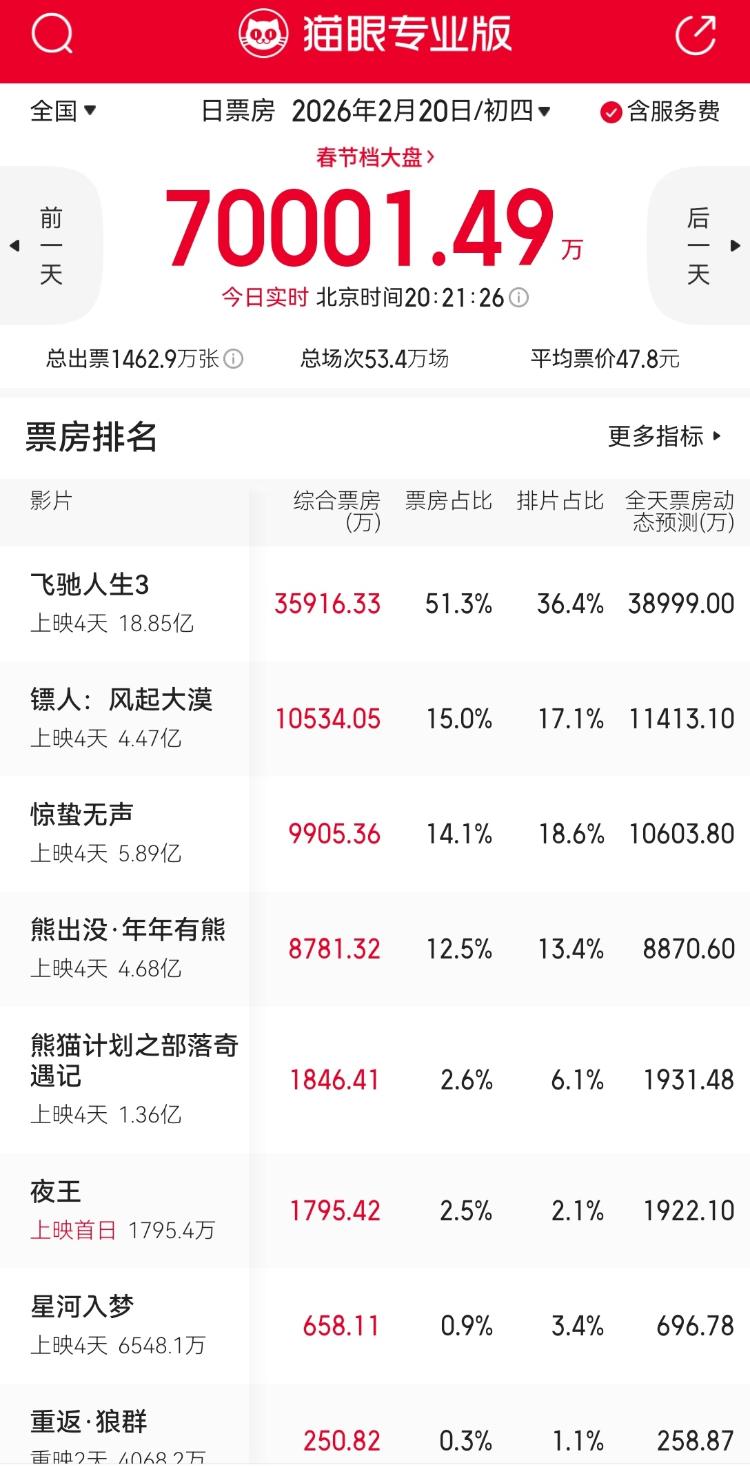 大湾讯 现在是大年初四,但我想不会有什么高光时刻。据网络票务平台相关数据显示,这一天票房收入突破7亿元,大年初四春节期间票房收入预计为38亿元。现在我遇到了一个有点尴尬的问题。历史上最长的春节期间,短短9天就可以达到70亿人次。大年初四票房收入达到7亿日元以上。今年的过年档也包括2月15日和16日,但更多的是一场准备工作的展示。价格不足3900万元、不足1400万元,这只是年货摊激烈竞争的前奏。大年初一至初三,贺岁档票房收入12.78亿元,随后为8.47亿元,8.02亿元,呈下降趋势。根据网络票务平台的票房收入预测,大年初四总票房收入约为7.5亿元,但春节期间(2月15日至23日,含预期票房收入)总票房收入勉强达到38亿元大关。距离农历新年仅剩三天。从往年春季票房收入曲线来看,季末基本没有上升曲线。截至春节初四票房收入38亿元,含预期票房收入。也就是说,算上今年春节后三天连续三场票房过十亿元的情况,期间总票房收入也只有68亿元。我个人的预测是2026年中国N今年的票房收入将有望跻身该时期中国电影史上的前五名。中国影史春节档票房收入前三名分别是2025年95.14亿元、2024年80.16亿元、2021年78.42亿元。第四位是2023年67.65亿元。《海兽3》在豆瓣的口碑下降了0.1个点。 《重返狼群》上映首日票房收入为 518 万美元,预计第二天票房收入将超过 200 万美元。 《夜王》将于大年初四在当地上映,预计首日票房将超过1900万日元。其他六部新片的格局基本保持不变。 《飞驰人生3》豆瓣评分虽然下跌0.1分至7.5分,但依然占据票房霸主,明天(大年初五)将突破20亿大关。它还获得了7.5的收视率。 收购《卫报:《大漠风起》因口碑引发票房收入飙升,大年初四票房收入有望超越《虫虫之沉默》,成为单日票房收入第二高的影片。但比《沉默》更尴尬的是,《星夜》不仅单日票房收入排在新片六强中垫底,大年初四也未能击败《夜王》新年到了,相信《飞驰人生3》的票房收入不会超过1亿,而《熊出没:年年有熊》也将继续保持沉默,成龙的电影不用说,市场是无情的,工具是理性的。 “Flying Life 3”计划的日历将在新月日启动 30% 的日历,在新月日启动 36.5% 的日历河电影节目减少至3.4%,仅《星河梦》安排在垃圾时段。也许是为了坚持下去而不是取消这部电影。大湾报记者 蒋楠楠