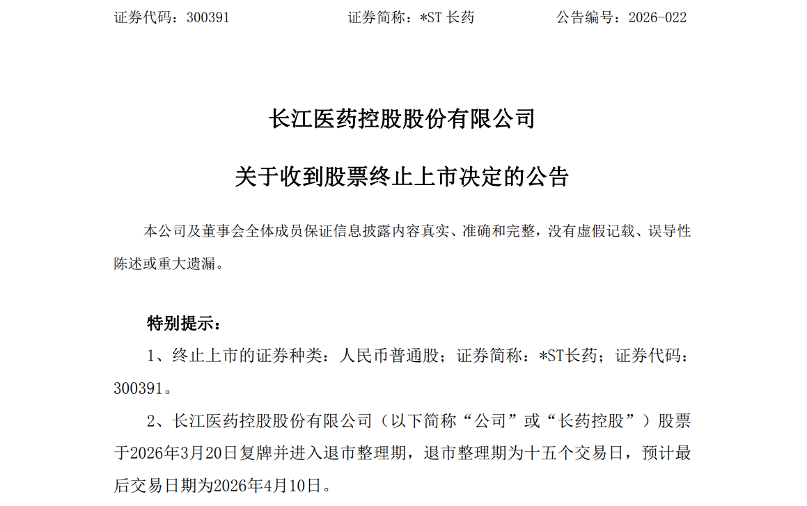 海报新闻记者 赵恩报道 据长江医药控股股份有限公司(以下简称“长江医药控股股份有限公司”)最新公告,公司收到深圳证券交易所股票退市决定。 3月12日,深圳证券交易所决定终止公司股票上市交易。公告显示,Nagayo Holdings股票将于2026年3月20日复牌,进入盘整期,在此期间将退市。合并退市期限为15个工作日,最后交易日定为2026年4月10日。 资料来源:深圳证券交易所 2026年1月23日,昌亚控股收到中国证监会《行政处罚决定书》。公司2021年至2023年年度报告披露内容存在虚假信息,涉及深圳证券交易所规定其股票退市的情况交换。决定显示,2020年11月,昌耀控股支付现金收购长江之星52.75%的股份。同年12月,扬子星纳入昌耀控股财务报表合并范围。扬子星原经理罗猛先生等人对扬子星2020年至2022年净利润等指标的业绩承诺。完成上述收购后,罗先生继续担任扬子星总裁、总经理,全面负责扬子星的经营管理。 2021年至2023年,长江旗下之星、扬子源、新丰药业通过虚假来单、来单等方式,未履行实际销售业务而确认收入,故昌药控股2021年至2023年年报中,其营业利润分别增加21,532.38万元、28,373.66万元、2元。 33、63.46万元,占本期已披露营业利润的9.12%、17.57%和19.51%。虚增的利润总额分别为5,640.14万元、6,337.52万元、4,370.5万元,分别占本期披露利润总额绝对值的35.62%、88.23%、6.42%。同时,长江伟庄中药城购物中心项目2022年亏损无法合理确认,故昌药控股2022年年报中利润总额虚增455.24万元,占本期披露利润总额的6.34%。最终,证监会作出责令改正、警告并处1000万元罚款的决定。昌耀控股表示,退市期间其股票将在深圳证券交易所风险警示板交易。公司股票进入退市首日涨跌幅不设限盘整期间,此后每日价格涨幅限制为20%。退市后,公司股票将转交全国证券交易所管理的退市板块。