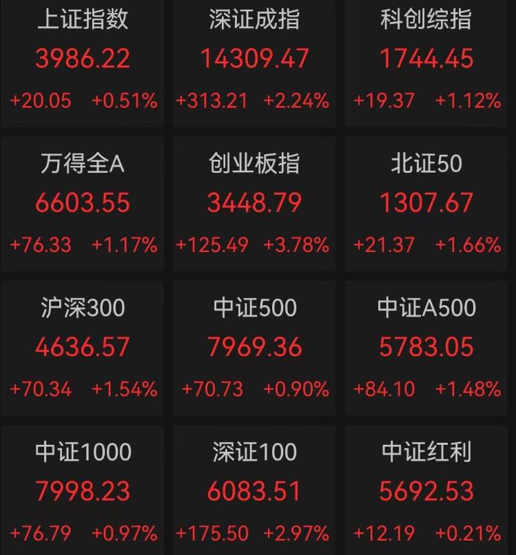 中新经纬4月10日电:周五A股上涨。盘中,上证综指收复4000点,创业板指涨幅超4.4%,创四年多来新高。截至收盘,上证指数上涨0.51%至3986.22点。深证成指上涨2.24%至14,309.47点。创业板指数上涨3.78%至3,448.79点。综合科技创新指数上涨1.12%,至1,744.45点。沪深股市成交量约23,228.69亿元,较上一交易日增加约1,887.93亿元。市场上,工业板块整体上涨:证券公司、电气工程、电网板块涨幅超过3.6%,电子元件电子、能源装备、摩托车、重型机械和精细化工板块涨幅超过2%。概念板块整体上涨d:电动电池、磷酸铁锂电池、钠离子电池、玻纤、锂电解液等板块涨幅超过4%,固态电池、锂正极、锂电池、电池回收等板块涨幅超过3%。此消息,4月9日晚,工业和信息化部发布消息称,工业和信息化部、国家发展改革委、市场监管总局、国家能源局联合召开动力及储能电池行业企业座谈会。会议强调,要坚决抵制不合理、不公平竞争行为,维护健康有序的市场环境。这是四个院系今年第二次举办类似的研讨会。前海开源基金首席经济学家杨德龙称电池“反下放”产业是一个有很大效益的产业。将打破行业供过于求的局面,给相关上市公司带来巨大利好。截至收盘,大盘上涨个股3977只,下跌个股1397只,其中涨停个股77只,跌停个股12只。个股方面,今日涨停个股有:永鼎股份(9.99%)、盛阳股份(10.03%)、德明利股份(10.00%)、戴东南(10.11%)、英唐智控(20.00%)。估值最低的个股如下:高能环境(-9.97%)、开川智能(-19.99%)、汇源通讯(-9.99%)、树华体育(-10.02%)、猎鹰(-10.01%)。换手率最高的五只股票为西盈电子、三锐智能、宇研复合材料、红板科技和美诺华,换手率分别为91.447%、81.831%、77.525%、63.943%和41.856%。展望后市,中国银行证券分析,4月份两大重要制约因素正在缓解。其次,霍尔木兹海峡的实际交通状况可能好于此前的极端预期。预计4月份市场风险偏好将逐步回升,A股将逐步回归基准价。 (中国/新加坡经纬APP)(本文观点仅供参考,不构成投资建议。投资涉及风险,入市需谨慎。)